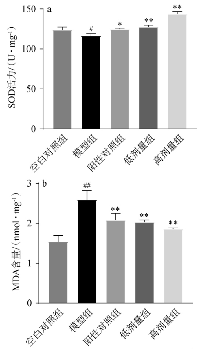 最后一天灌胃90 min后,立即剖取小鼠肝脏,并切取小鼠肝脏右叶,使用生理盐水冲洗后,置于4%的甲醛溶液中进行固定。 肝脏组织经过苏木精-伊红(hematoxylin-eosin,HE)染色后,采用显微镜(放大倍数200×)观察其病理组织学变化,并对肝脏组织的异常病变情况进行病理学分析。