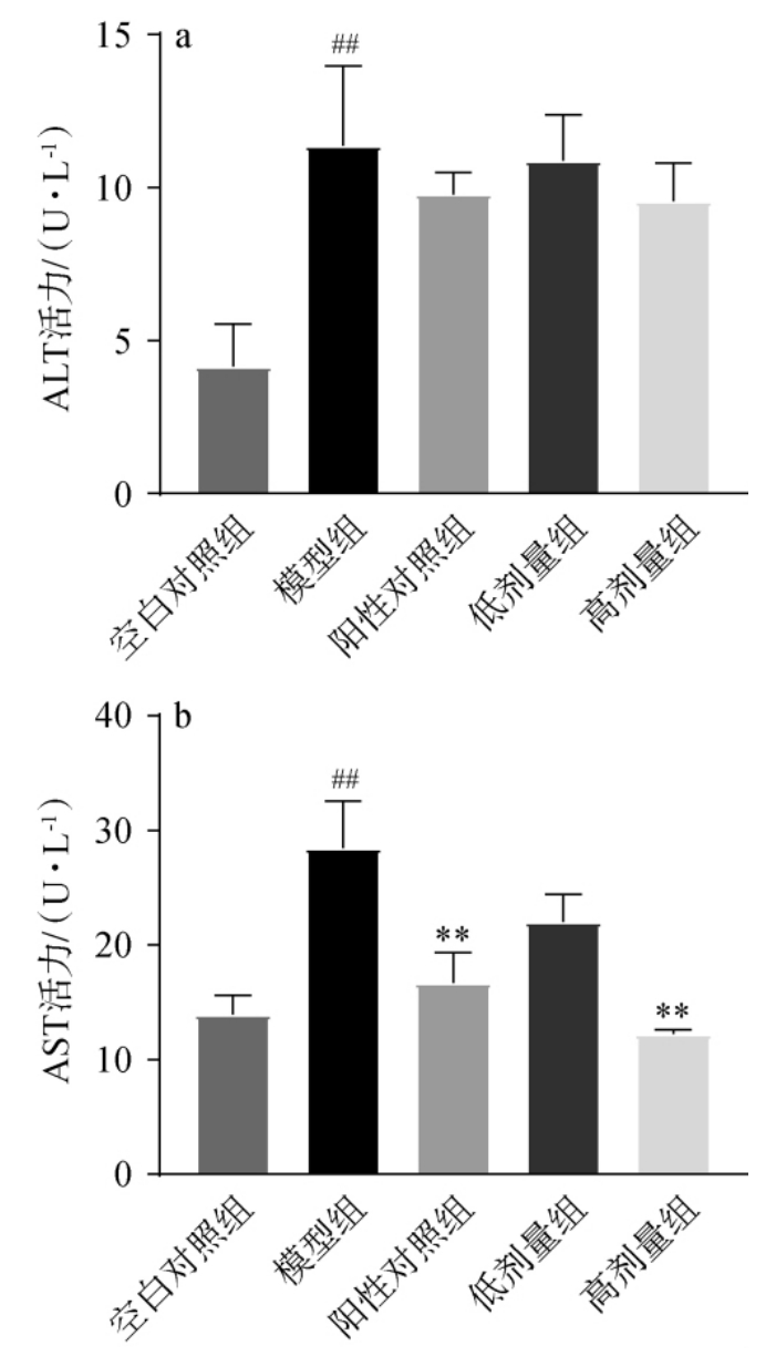 血清样本的采集及生化指标测定:最后一天灌胃90 min后,通过眼眶静脉采血,样本静置1 h后,使用微量冷冻离心机在4 ℃、3 500 r/min条件下离心15 min,取上清,按照试剂盒说明书测定血清中ALT、AST含量。