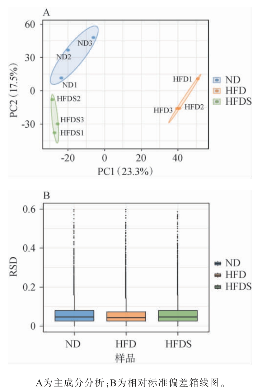 采用SPSS statistics 22.0及GraphPad Prism 8.0对各组数据进行统计分析及绘图,定量数据以“平均值±标准差”的形式呈现。 使用景杰生物云工具进行主成分分析(principal component analysis,PCA)和相对标准差(relative standard deviation,RSD)2种可视化统计分析,评估样品重复性。
