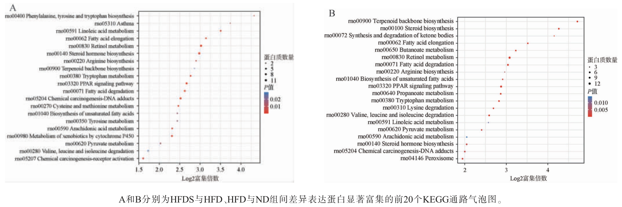 进一步针对两个比较组间的差异表达蛋白进行京都基因与基因组百科全书(Kyoto Encyclopedia of Genes and Genomes,KEGG)通路富集分析,并筛选显著富集的前20条通路(P<0.05),结果见图8。 由图8可知,HFDS组与HFD组间的差异表达蛋白主要富集于亚油酸代谢、脂肪酸伸长、视黄醇代谢、过氧化物酶体增殖物激活受体(peroxisome proliferator-activated receptor,PPAR)信号通路、脂肪酸降解、半胱氨酸和蛋氨酸代谢、不饱和脂肪酸的生物合成、花生四烯酸代谢和丙酮酸代谢等代谢相关通路;HFD组与ND组间的差异表达蛋白主要富集于类固醇的生物合成、酮体的合成和降解、脂肪酸伸长、视黄醇代谢、脂肪酸降解、不饱和脂肪酸的生物合成、PPAR信号通路、花生四烯酸代谢、丙酮酸代谢、亚油酸代谢和过氧化物酶体等代谢通路,表明贵州红酸汤对高脂饮食大鼠的调控作用是多途径、多效应的。高脂饮食引起机体游离脂肪酸过量,导致肝脏中线粒体功能障碍释放过多的活性氧,引起细胞中内质网及溶酶体等细胞器功能失调[16],与慢性炎症等因素共同作用引发肝脏代谢紊乱以及免疫功能受损等问题[17]。 KEGG富集的多个代谢通路均与线粒体健康密切相关。如PPAR可调节线粒体的生物发生、脂肪酸氧化等过程[18],同时,过氧化物酶体增殖物激活受体γ辅激活因子1α(peroxisome proliferator-activated receptor gamma coactivator 1 alpha,PGC-1α)等与PPAR信号通路相关的因子也参与线粒体的稳态调节[19]。半胱氨酸的代谢产物谷胱甘肽在维持线粒体的氧化还原平衡中起重要作用,参与抵御氧化应激,保护线粒体免受氧化损伤[20]。花生四烯酸在环加氧酶等作用下生成前列腺素等活性物质,可影响线粒体的呼吸功能、氧化磷酸化过程等,进而调节细胞的能量代谢[21]。 综上所述,贵州红酸汤可能通过线粒体等靶器官及脂质代谢、不饱和脂肪酸代谢、丙酮酸代谢和免疫调节等通路改善高脂饮食大鼠肝脏代谢紊乱。