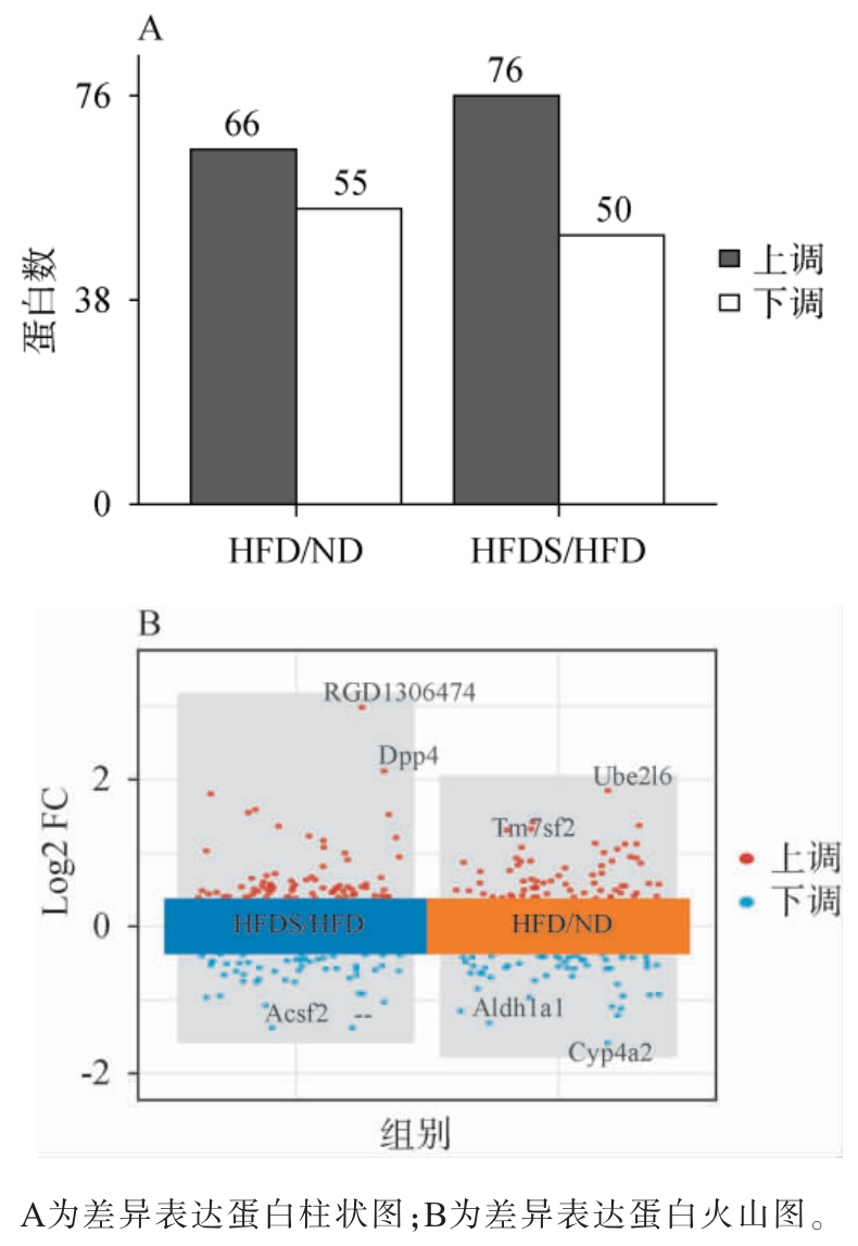 以P<0.05和两组间蛋白定量值差异倍数(FC)>1.3或<1.3作为筛选条件,从HFDS组与HFD组、HFD组与ND组中筛选差异表达蛋白,结果见图6。由图6可知,在HFDS组与HFD组中共鉴定出126个差异表达蛋白,HFD组与ND组中共鉴定出121个差异表达蛋白,与ND组相比,55个差异蛋白在HFD组中表达显著上调,66个差异蛋白表达显著下调;与HFD组相比,76个差异蛋白在HFDS组中表达显著上调,50个差异蛋白表达显著下调。
