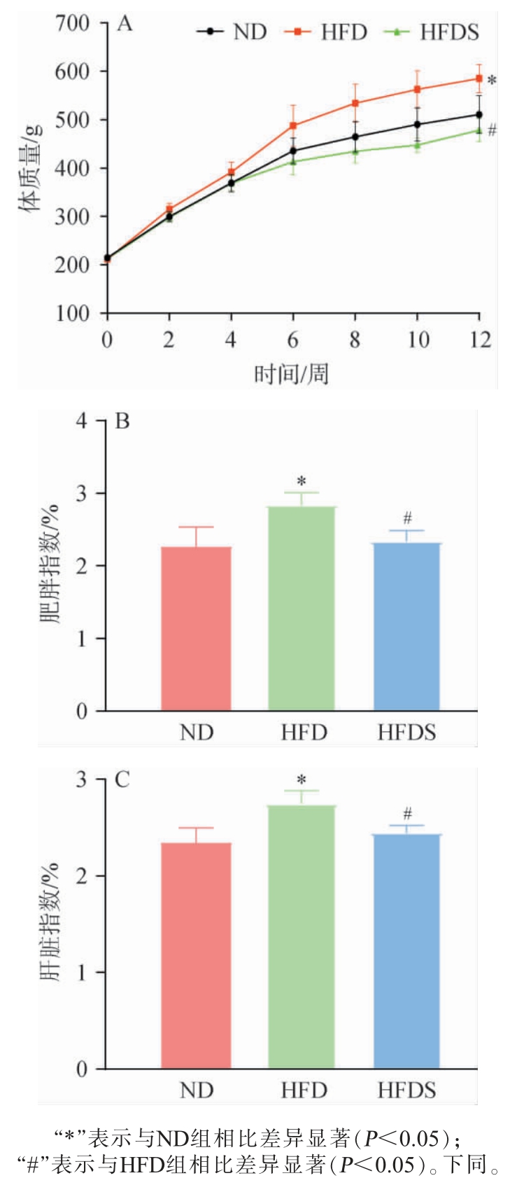 图1 贵州红酸汤对高脂饮食大鼠体质量(A)、肥胖指数(B)和肝脏指数(C)的影响