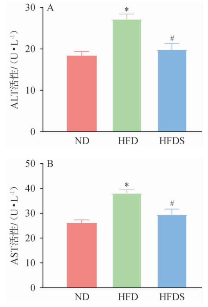 贵州红酸汤对高脂饮食大鼠肝功能的影响见图3。 由图3可知,与ND组相比,HFD组大鼠血清中ALT、AST的活性显著升高(P<0.05)。与HFD组相比,HFDS组大鼠血清中的ALT和AST活性均显著降低(P<0.05),说明贵州红酸汤干预能够有效改善高脂饮食诱导的大鼠肝功能损伤。
